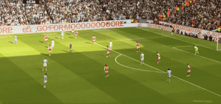 半场结束,两队1-1暂时战成平局。下半场开始后,曼城攻势如潮,哈兰德的射门击中立柱。